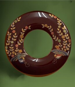 こちらのお品はタメ塗で仕上げた後鳳凰の蒔絵を描きました。