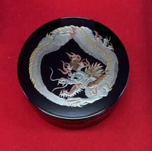 香合に金粉、プラチナ粉を蒔き、龍図を